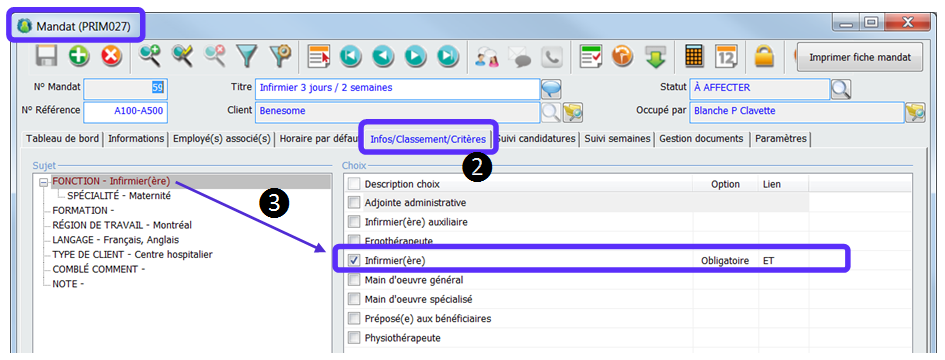 1.Dans l’onglet info/classement/critères du mandat. 2.Vérifier les choix qui sont obligatoires dans chaque sujet et assurez-vous que les mêmes sont sélectionnés dans le dossier du candidat dans l’onglet « Infos/Classement/Critères ». (S’assurer que le candidat n’a pas l’option « Refuse » dans tous ces choix.) 3.Au minimum une fonction (ou profession, ou titre, etc.) doit être cochée avec l’option « obligatoire » dans le mandat.