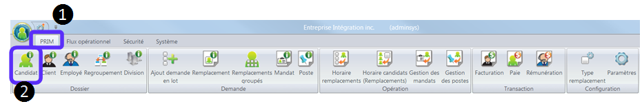 1.Dans le ruban « PRIM ». 2.Cliquez sur le dossier « Candidat ».