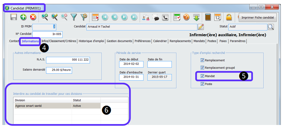 3.Trouvez le candidat qui n’apparaît pas. 4.Cliquez sur l’onglet « Informations ». 5.Assurez-vous que le type d’emploi recherché « Mandat » est coché. 6.Aussi assurez-vous que la division pour laquelle le mandat a été créé n’apparaît pas dans la section « Interdire au candidat de travailler pour ces divisions ».
