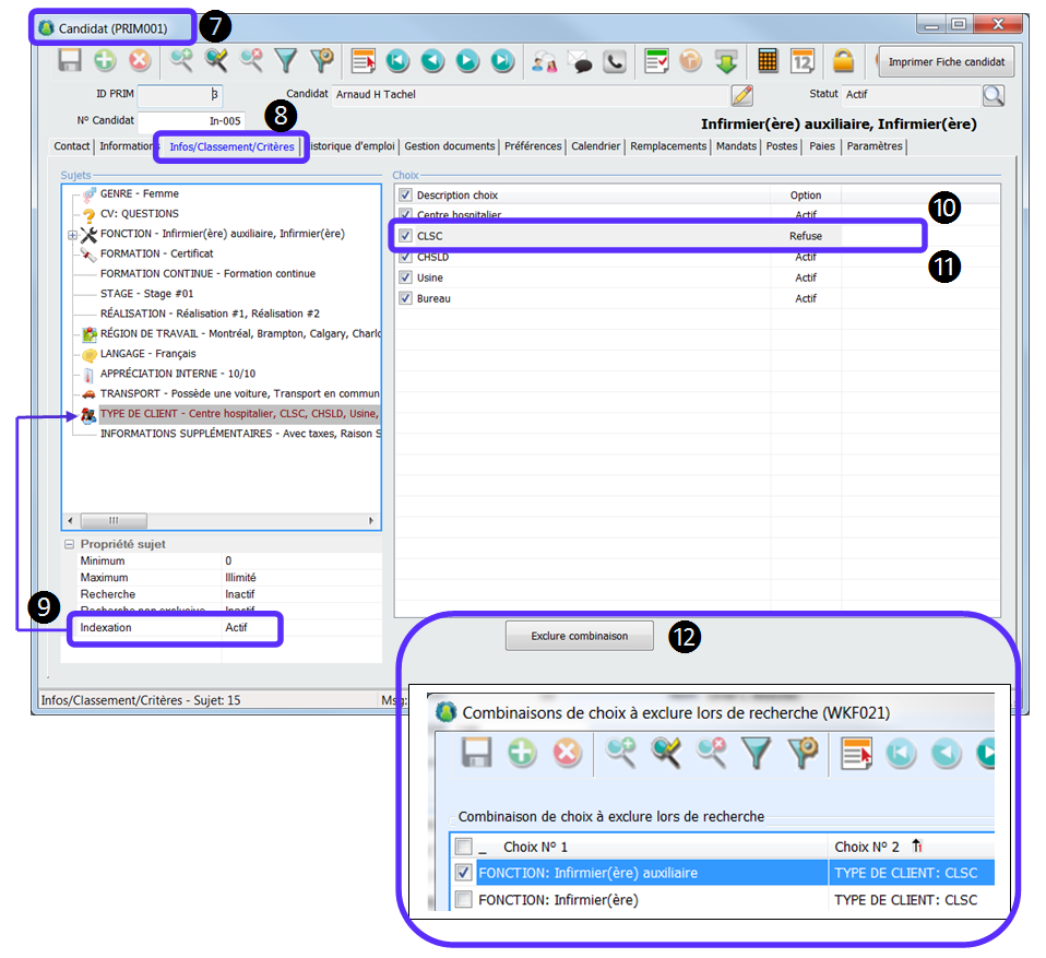 7.Toujours dans le dossier « Candidat ». 8.Cliquez sur l’onglet « Infos/Classement/Critères ». 9.Parmi les sujets « Actif » pour l’indexation. 10.Assurez-vous que tous les choix qui ont l’option (Exigences) correspondent au mandat. 11.Vérifiez aussi s’il y a des choix qui ont l’option (Refuse) parmi les choix demandés par le mandat. 12.Vérifiez s’il y a quelque chose dans le bouton « Exclure combinaison » qui pourrait empêcher la correspondance avec le mandat.