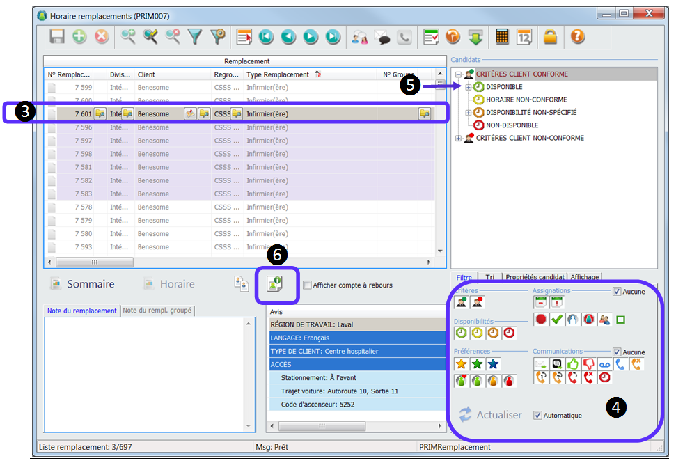 3-Sélectionnez le remplacement concerné. La ligne du remplacement devient grise. 4-Dans l’onglet « Filtre » assurez-vous que tous les icônes sont cochés. 5-Déployez la liste des candidats en cliquant sur tous les +. 6-Cliquez sur l’icône « Remplacement ».