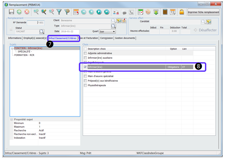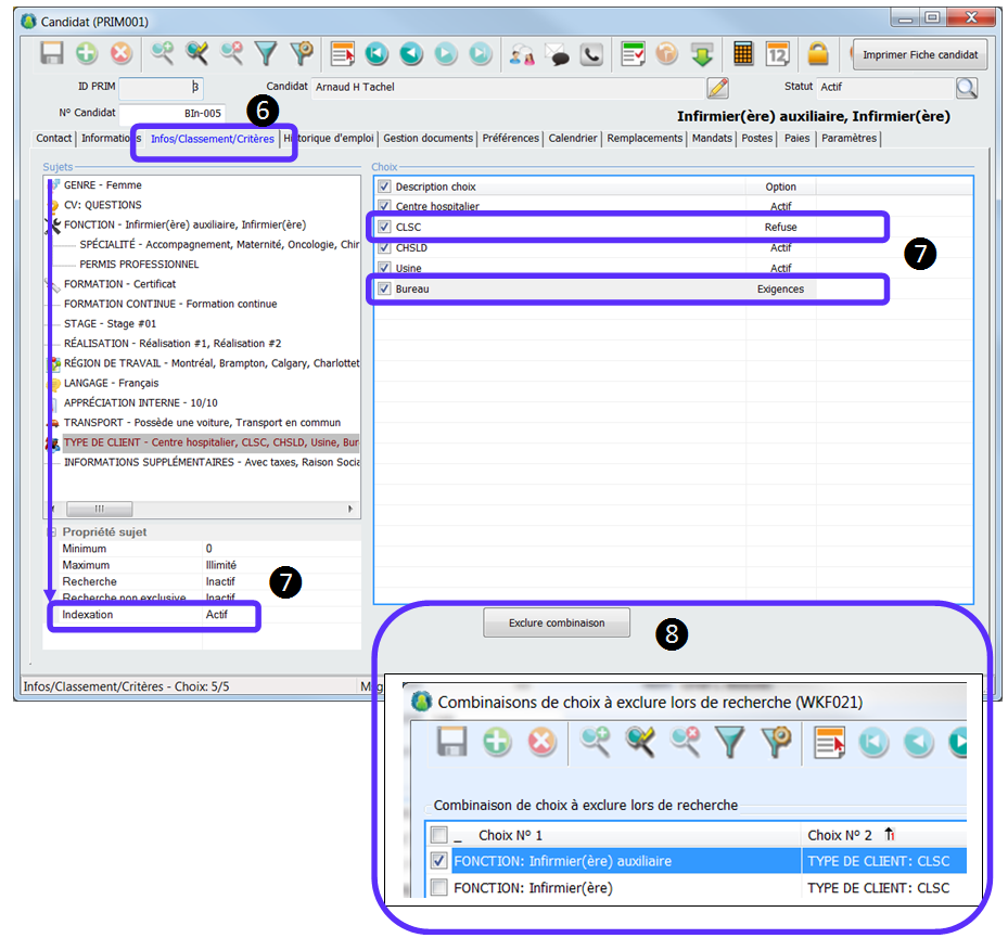 6.Toujours dans le dossier « Candidat », cliquez sur l’onglet « Infos/Classement/Critères ». 7.Pour tous les sujets qui sont actif pour l’indexation : ✍Assurez-vous que les choix qui ont l’option (Exigences) correspondent au remplacement. ✍Vérifiez aussi s’il y a des choix qui ont l’option (Refuse) parmi les choix demandés par le remplacement. 8.Vérifiez s’il y a quelque chose dans le bouton « Exclure combinaison ».
