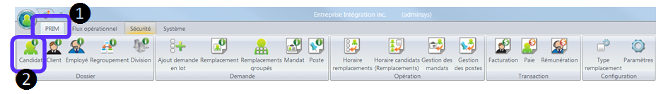 1.Dans le ruban « PRIM ». 2.Cliquez sur le dossier « Candidat ».