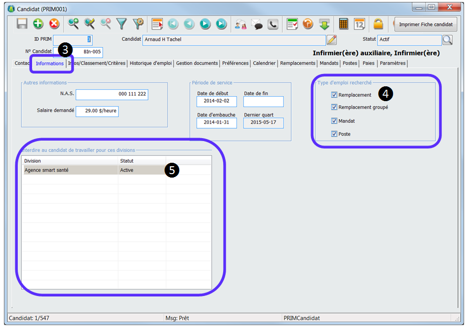 3.Cliquez sur l’onglet « Informations ». 4.Assurez-vous que le type d’emploi recherché « Remplacement » est coché. 5.Aussi assurez-vous que la division pour laquelle le remplacement a été créé n’apparaît pas dans la section « Interdire au candidat de travailler pour ces divisions ».