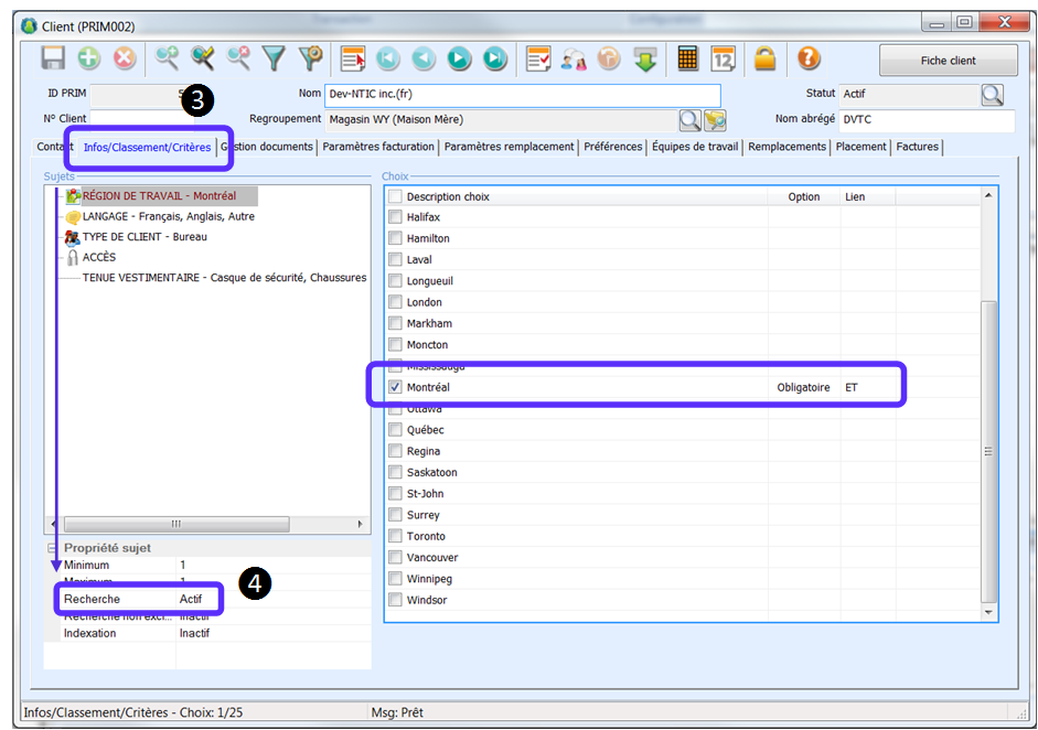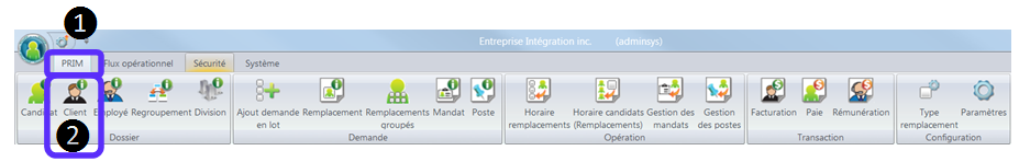 1.Dans le ruban « PRIM ». 2.Cliquez sur le dossier « Client ».