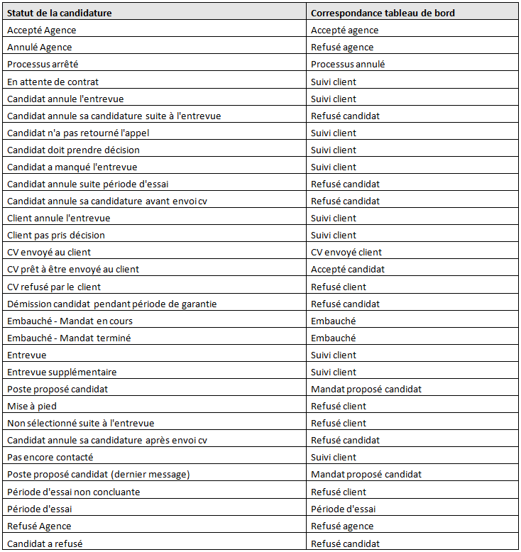 Tableau des correspondances entre les statuts de candidature et le tableau de bord.