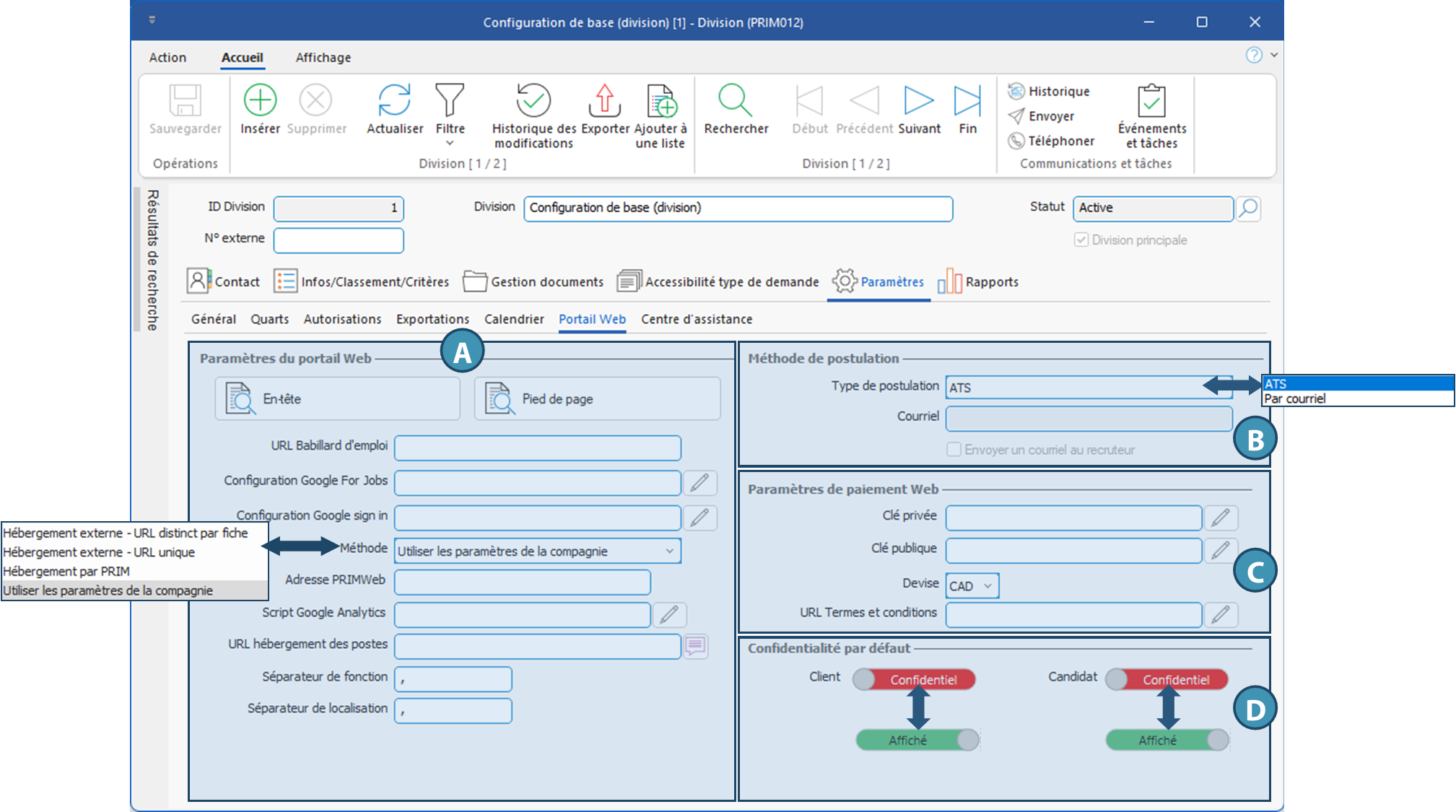 Cet onglet permet de configurer différents éléments propres à la division, comme un portail web et babilard d'emploi, la méthode de postulation privilégiée sur le Web, les paramètres de paiement Web pour les clients, et la confidentialité par défaut pour les candidats et les clients de la division.