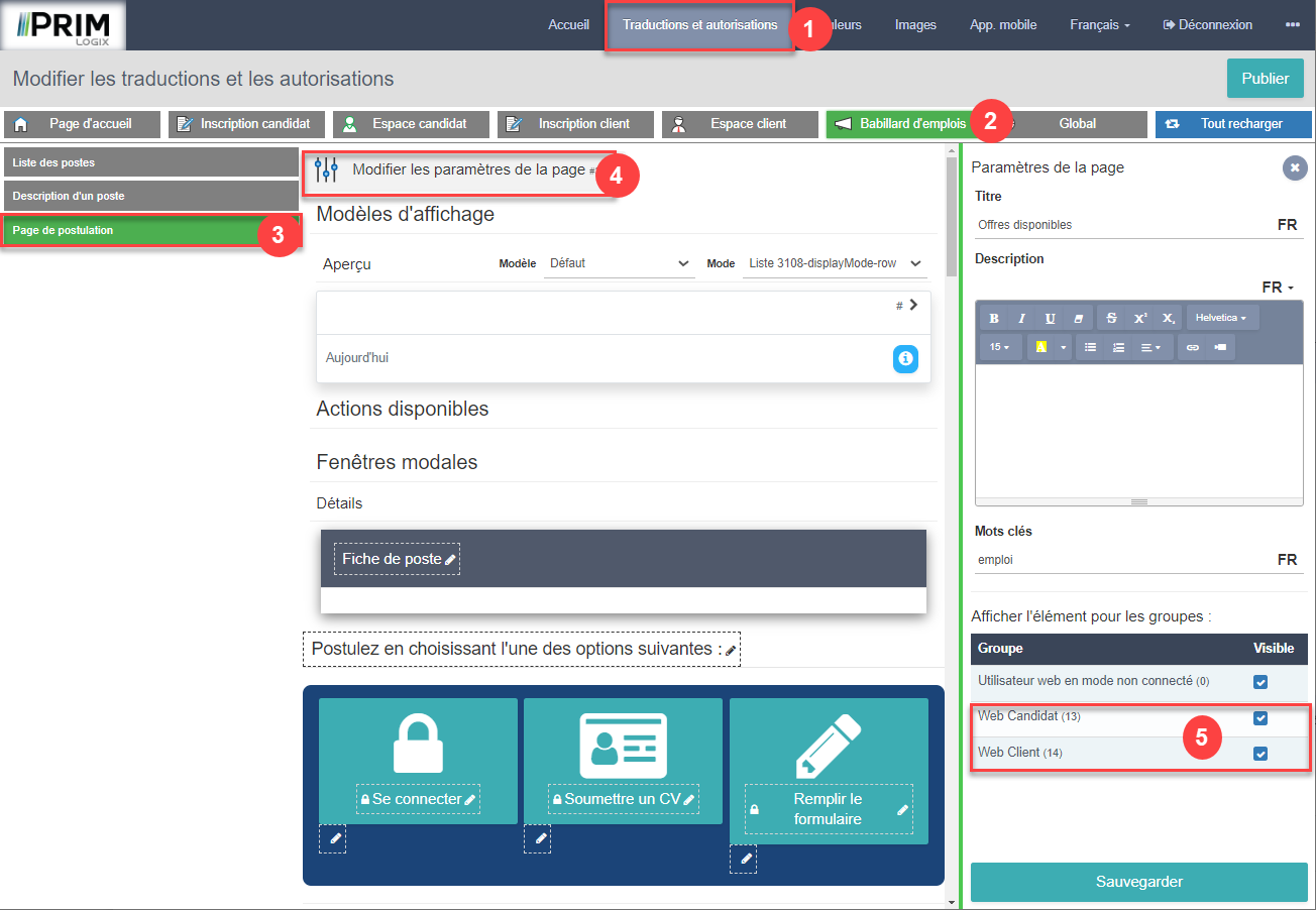 Action client : Dans le back office, dans Traductions et autorisations > Babillard d'emplois > Page de postulation > Modifier les paramètres de la page, s'assurer que les groupes de sécurité appropriés sont cochés. (Voir image) |