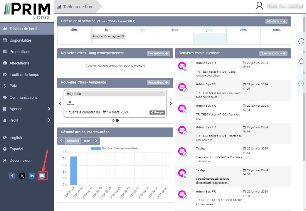 7.Portail Web candidat et client : Une icône permettant d’envoyer un courriel à l’agence a été ajoutée. Cette icône est située tout au bas du panneau de gauche. (Voir image)