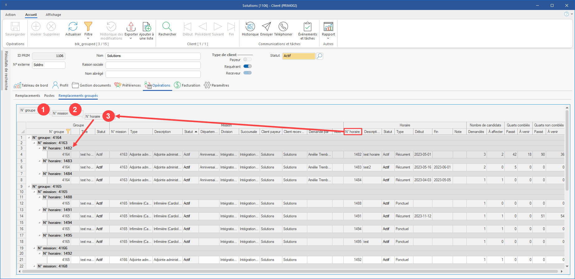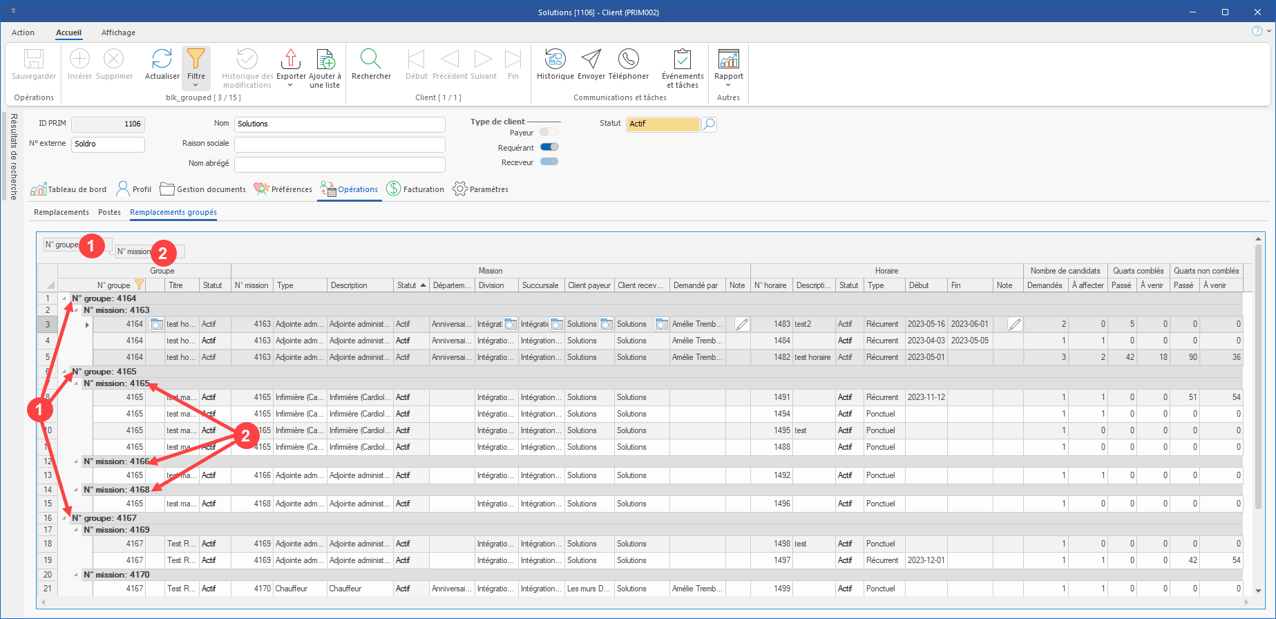 1.Dossier client : Dans l’onglet Opérations, un nouveau sous-onglet a été ajouté pour permettre de visualiser seulement les quarts groupés. Par défaut, le tout est trié par Groupe, puis par Mission. (Voir image)