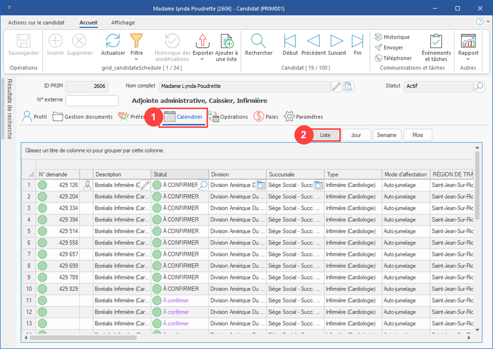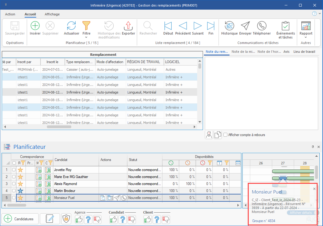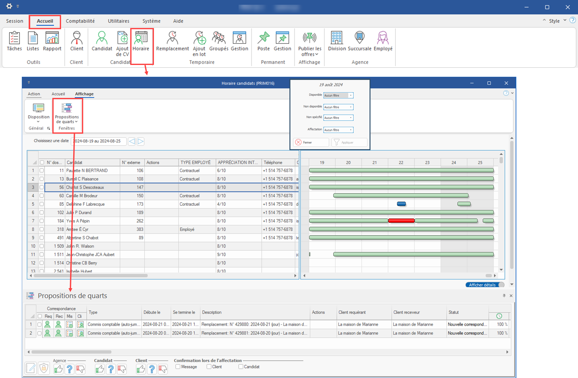 2.Fenêtre Horaire candidats (PRIM016) : Nouvelle fenêtre qui donne un aperçu des disponibilités, des affectations et des heures travaillées pour tous les candidats, avec plusieurs possibilités de filtres, et la possibilité d’affecter les candidats au moyen du volet Proposition de quarts. (Voir image)