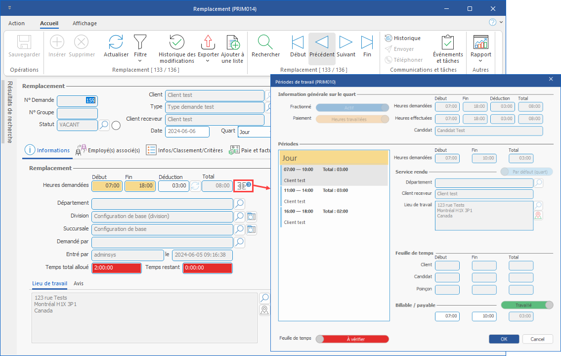 1.Quarts fractionnés : Possibilité de créer des quarts fractionnés, c’est-à-dire des affectations composées de plusieurs périodes de travail entrecoupées par des pauses au cours d’une même journée. À cet effet, une nouvelle fenêtre (PRIM010), a également été créée afin de permettre de voir ou modifier les périodes de travail incluses dans le quart fractionné. Cette fenêtre est accessible au moment de la création dans l'ajout en lot, dans la fenêtre Quarts (PRIM014), ainsi que dans les modèles de demandes. Le bouton