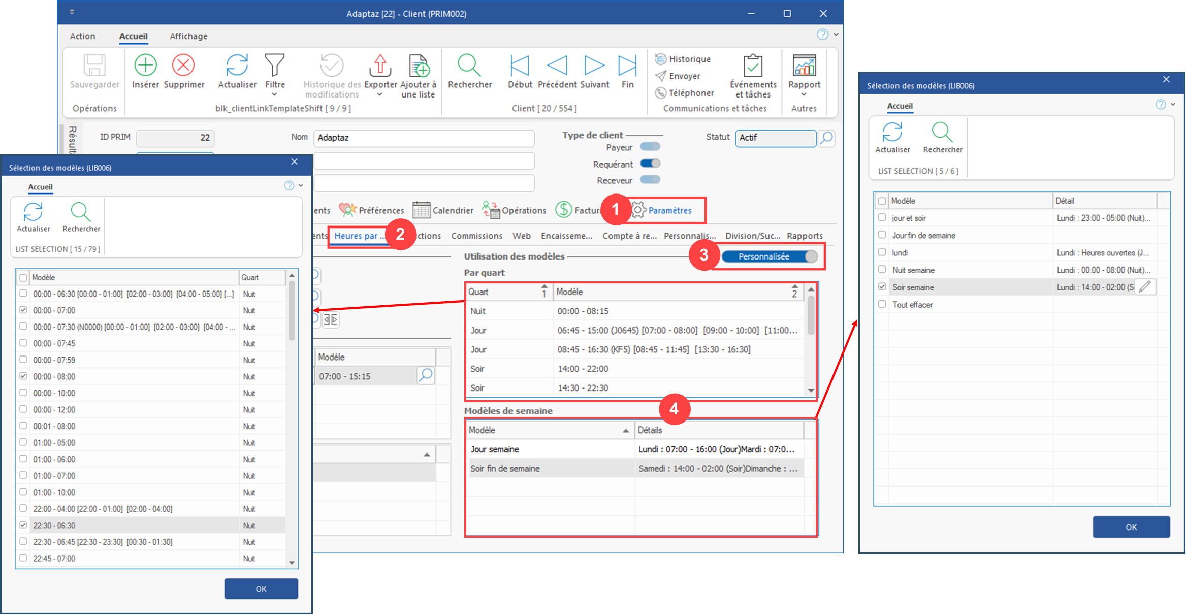 3.Modèles de demande (horaires) : Nouvelle fonctionnalité permettant de filtrer les modèles de demande par client. Il est ainsi possible de donner accès à tous les modèles, ou seulement à certains.