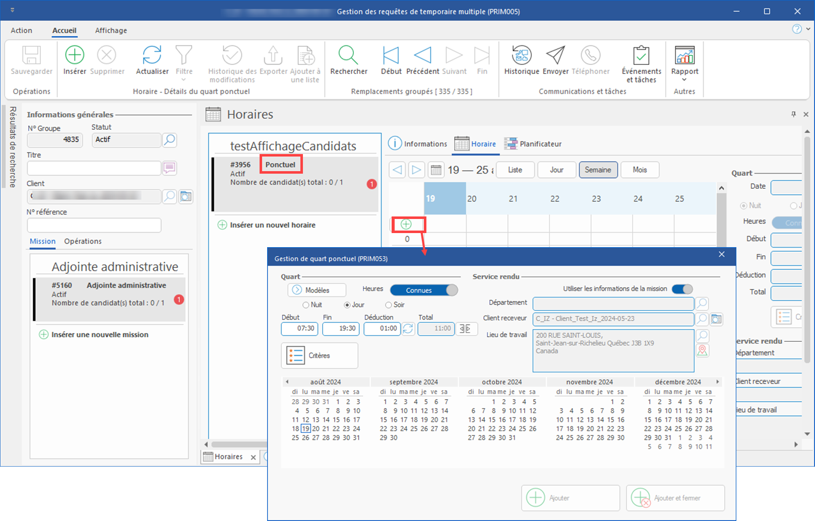 10.Volet Proposition de quarts : Pour les quarts faisant partie d'un horaire d'unee demande groupée, les colonnes Débute le et Se termine le affichent maitenant l'heure en plus de la date. À noter que le champ Se termine le n'affiche toutefois des données que si une date de fin existe pour l'horaire concerné. (Voir image)