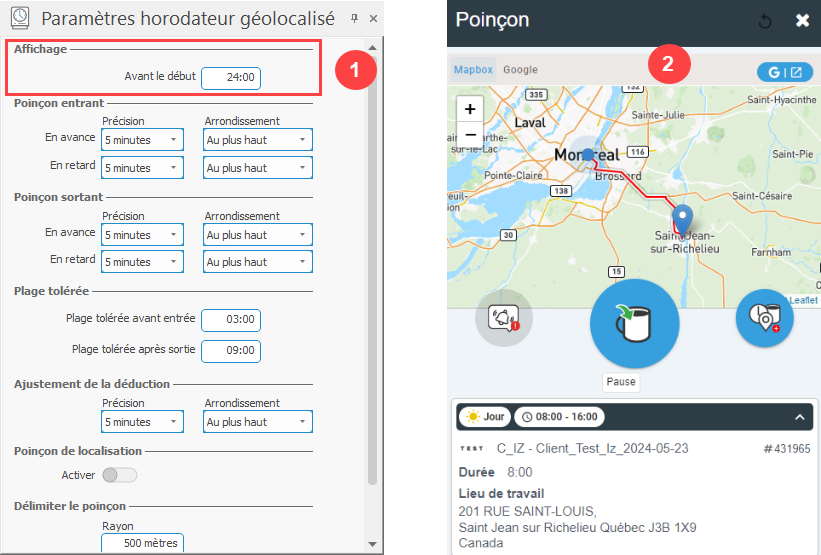 11. Horodateur géolocalisé (poinçon) : Le poinçon étant associé à la possibilité d’afficher le lieu de travail sur la carte, un champ a été ajouté dans les paramètres pour permettre l’affichage du poinçon avant qu’il ne soit possible de l’utiliser selon les plages tolérées (1). Par ailleurs, le design des poinçons et de la carte qui les affichent sur le portail Web a été amélioré. (2). (Voir image)