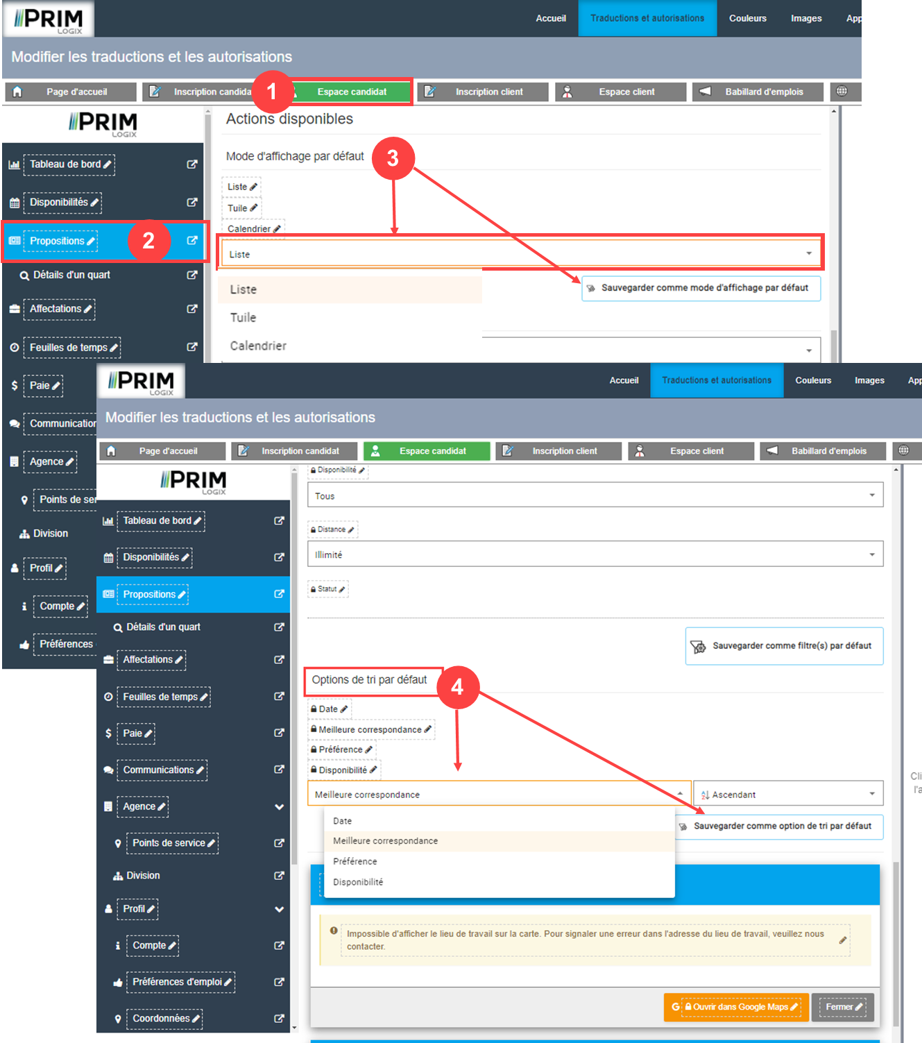 9.Portail Web et affichage et tris par défaut : Ajout d’un tri et d’un mode d’affichage par défaut (liste ou tuile) dans les préférences utilisateur dans différentes pages du portail candidat et du portail client. (Voir image préférences utilisateur candidat, page Proposition)