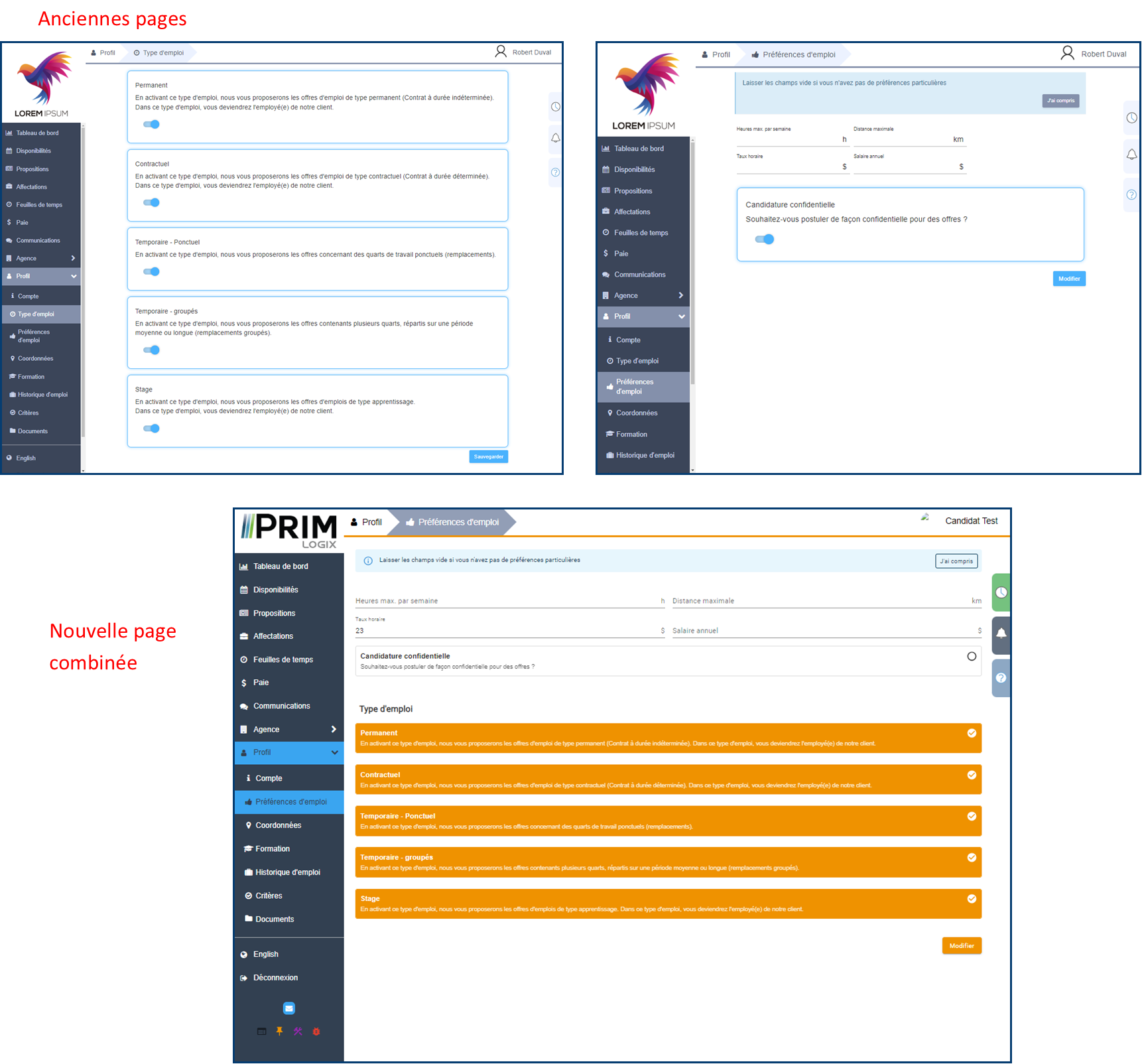 16. Portail Web Candidat : Afin de simplifier le profil candidat sur le Web, les pages Type d'emploi et Préférences d'emploi ont été combinées en une seule page. (Voir image)