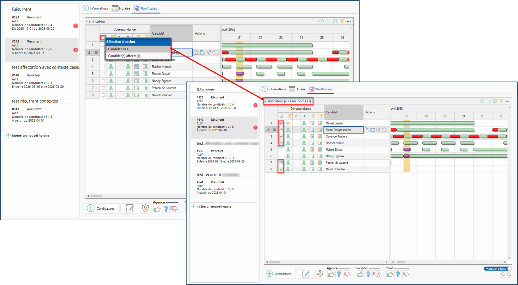 6.Planificateur des demandes groupées - nouveau menu pour les cases à cocher : Dans le planificateur des demandes groupées, lorsqu'au moins 1 candidat est déjà affecté à un horaire qui en exige plusieurs, un nouveau menu contextuel sur la case servant à cocher tous les candidats permet maintenant de sélectionner seulement les candidats pertinents selon le contexte, soit les candidats déjà affectés (pour confirmation ou autre), ou les candidatures (candidats non affectés). Par ailleurs, lorsque des candidats sont cochés au moyen du menu ou manuellement, le nombre de candidats cochés est indiqué dans le haut du planificateur. (Voir image)