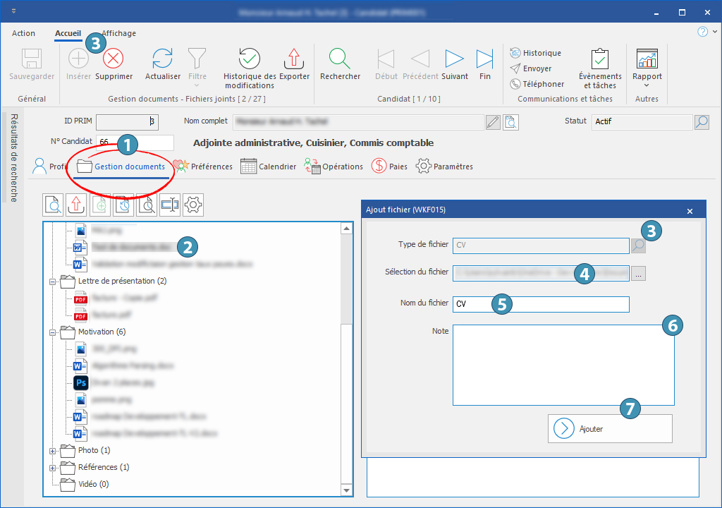 Dans l'exemple ci-dessous, nous utilisons la fenêtre « Candidat » pour l'ajout d'un curriculum vitæ.