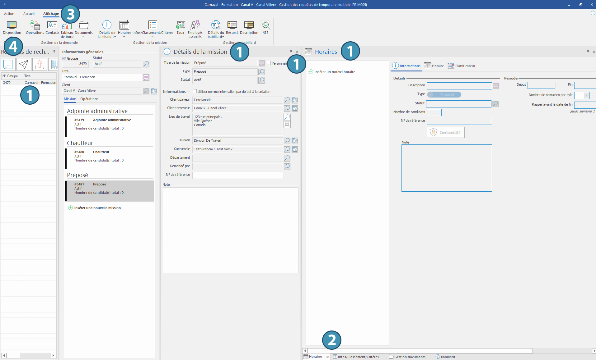Le menu « Affichage » vous permet de visualiser les volets disponibles dans la fenêtre. Cliquez sur un sujet pour ouvrir le volet correspondant (3). Utiliser le bouton « Disposition » pour enregistrer, charger ou modifier une disposition de volets particulière (4). Pour en savoir plus, consultez la section « Enregistrer une configuration d’affichage ».