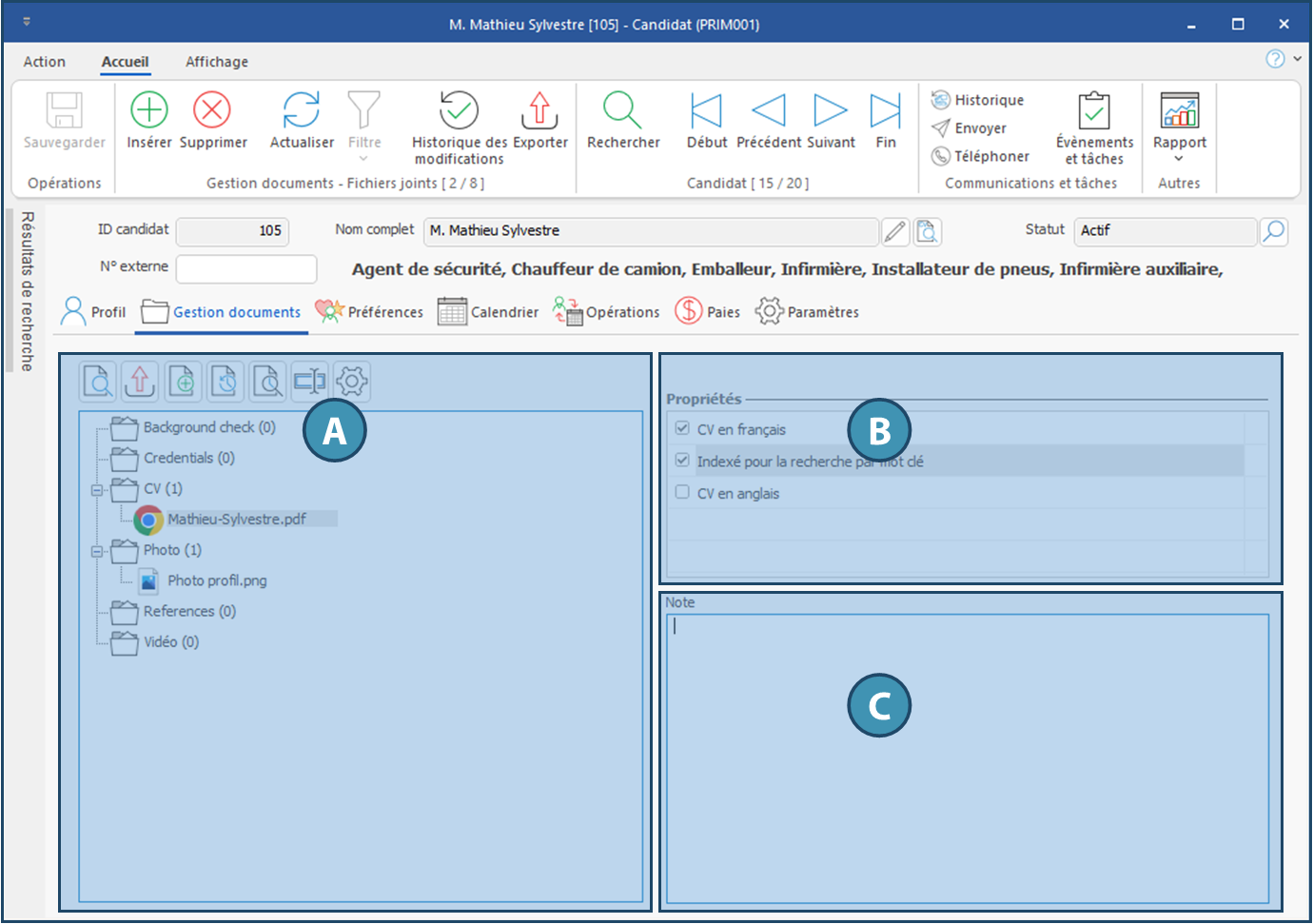 L'onglet « Gestion documents » regroupe tous les documents pertinents à joindre au dossier du candidat. Par exemple, un curriculum vitæ ou une photo.