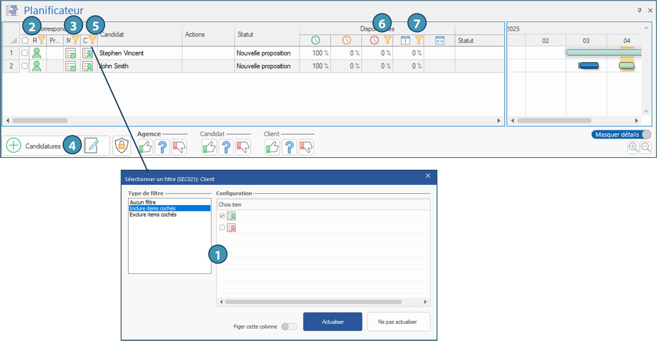 sur les en-tête de colonne du planificateur. Pour retirer un filtre, il suffit de faire un clic droit sur l'en-tête de la colonne concernée et de choisir l'option Aucun filtre dans la fenêtre qui s'affiche, et cliquer sur Actualiser (1).