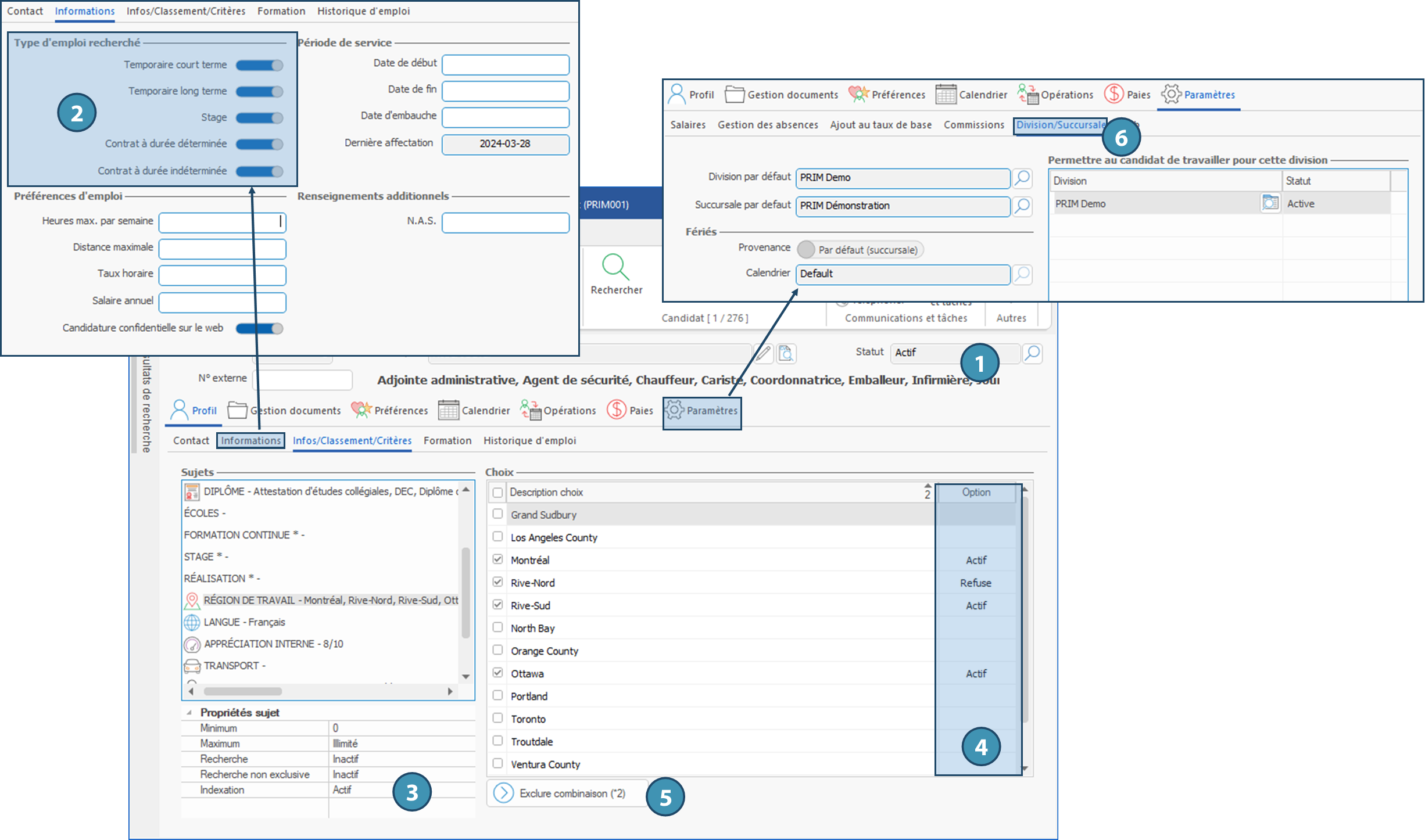 6.Dans l'onglet Paramètres / sous-onglet Division/succursale, assurez-vous que le candidat est autorisé à travailler pour la division correspondant à la demande.