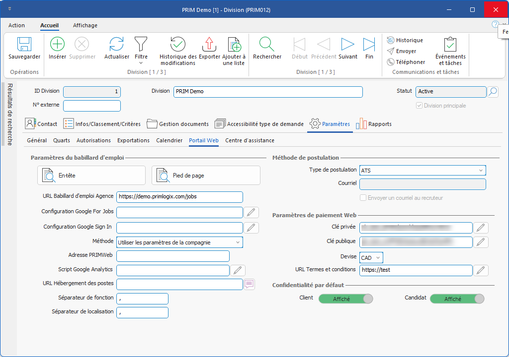 c.champ Adresse PRIMWEB dans les fenêtres Gestion des entreprises ou Division.