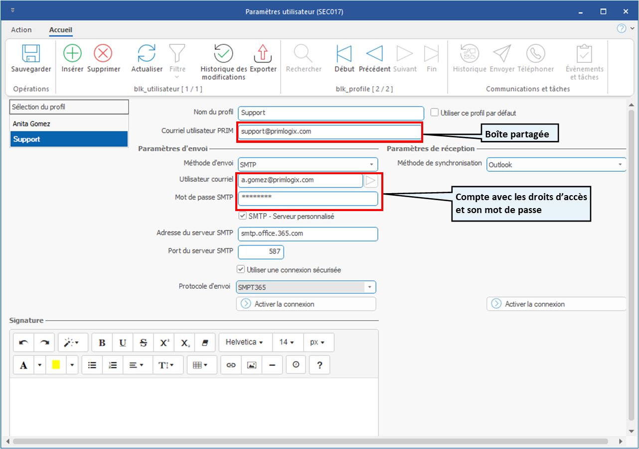 Exemple : a.gomez@primlogix.com/support@primlogix.com