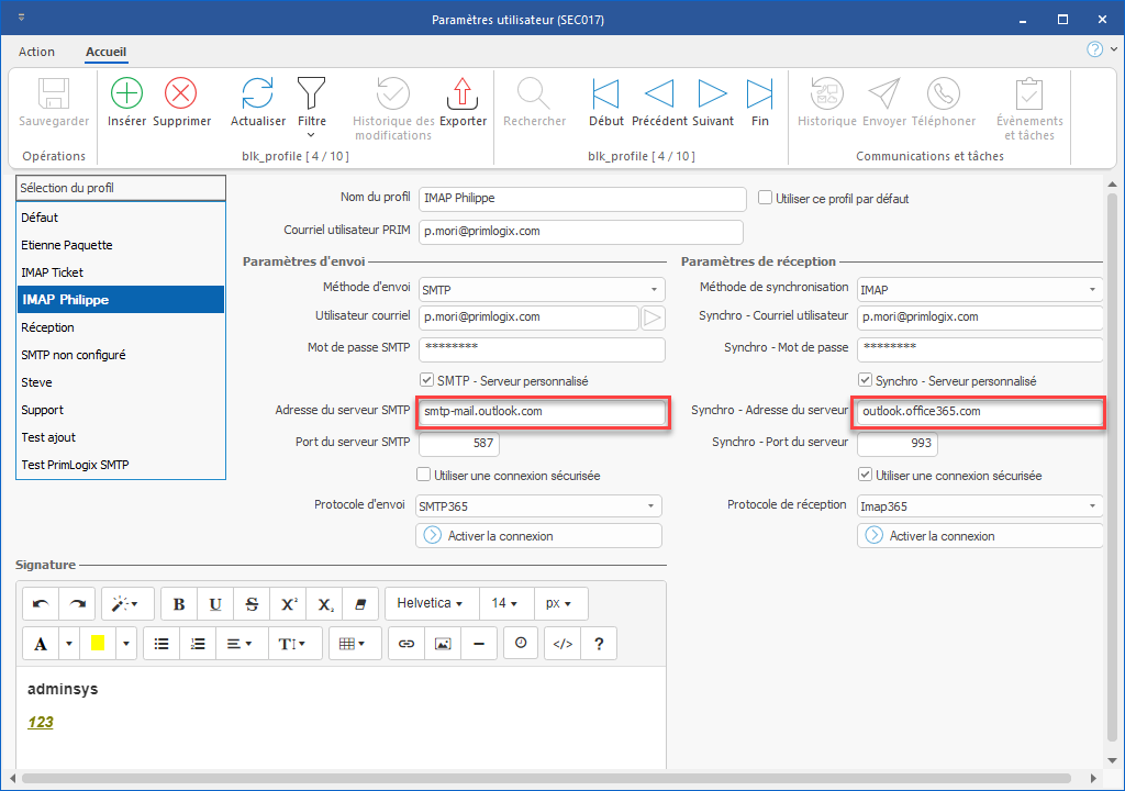 Voici les informations des serveurs office 365 exchange online. Ces renseignements doivent être insérés dans les champs appropriés dans le profil utilisateur.