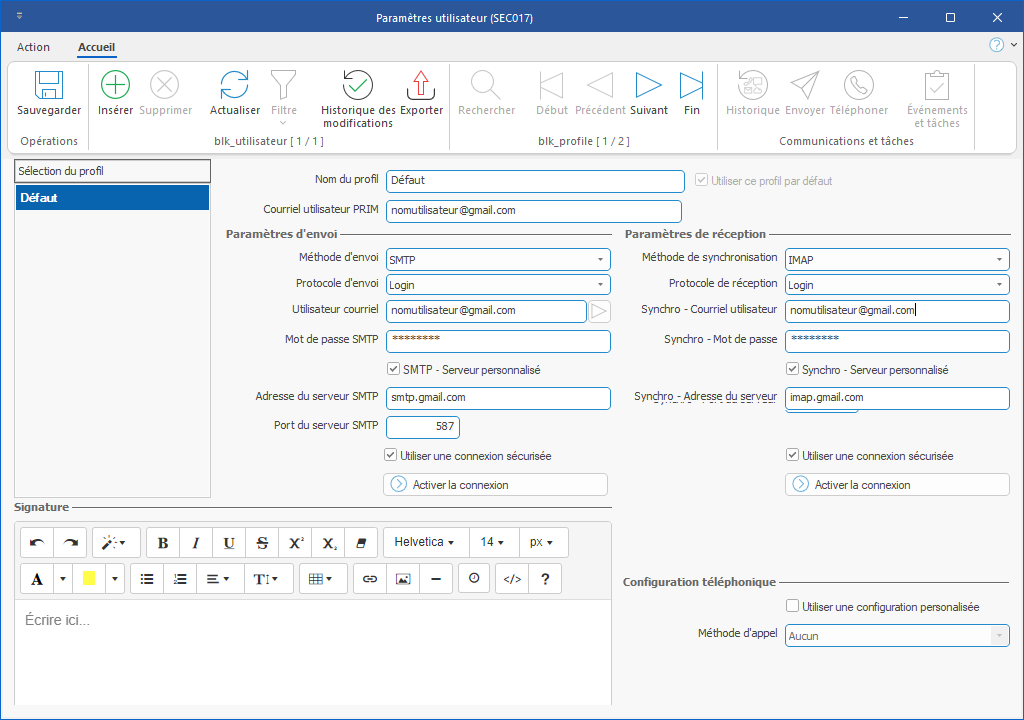 Lors de la création du profil, il faudra activer la connexion en cliquant sur le bouton correspondant. Toutefois, seul l'utilisateur inscrit dans le champ « Utilisateur courriel » pourra effectuer cette opération.