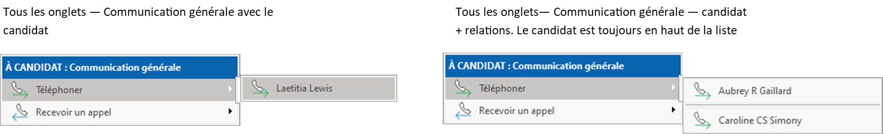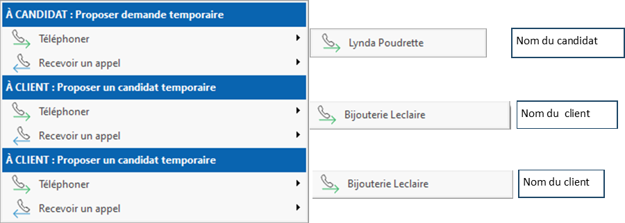 Il est possible de créer un résumé d'appel à partir de la fenêtre candidat, de la fenêtre client et de plusieurs autres fenêtres pour un appel effectué ou reçu. Les listes de choix pour un appel sont différentes selon le contexte et la fenêtre de départ.