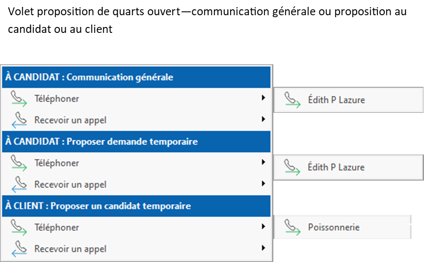 Les options possibles pour le résultat de l'appel dépendent du contexte et d'autres options seront disponibles lorsque l'appel est lié à un quart ou une candidature. Par exemple, lors d'un appel à un candidat pour proposer un quart, les options Accepte ou Refuse seront disponibles, et auront pour effet de modifier le statut de la candidature, et possiblement le statut du quart si le candidat a accepté.