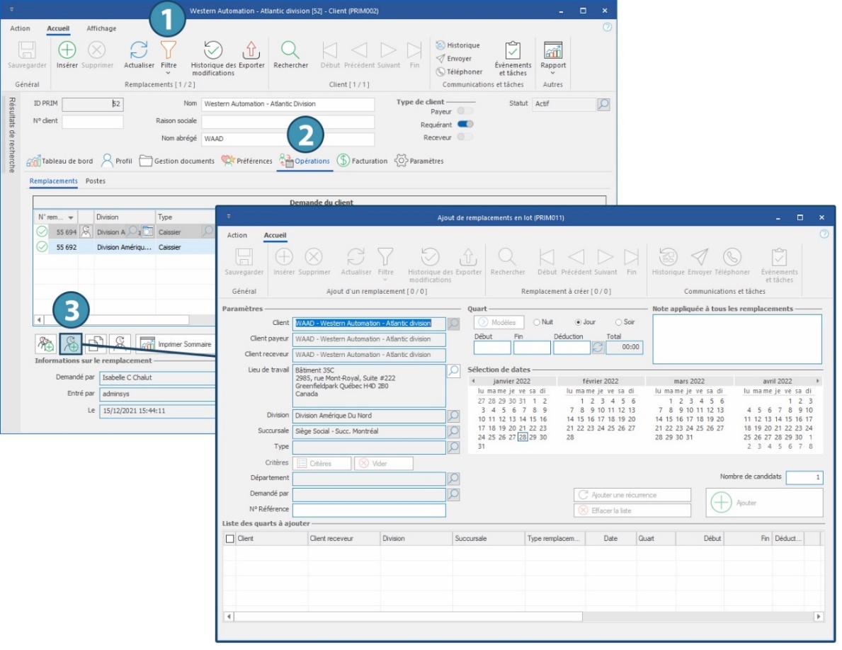). La fenêtre « Ajout des quarts en lot » s'affiche. Notez que les informations par défaut du client sont déjà inscrites.