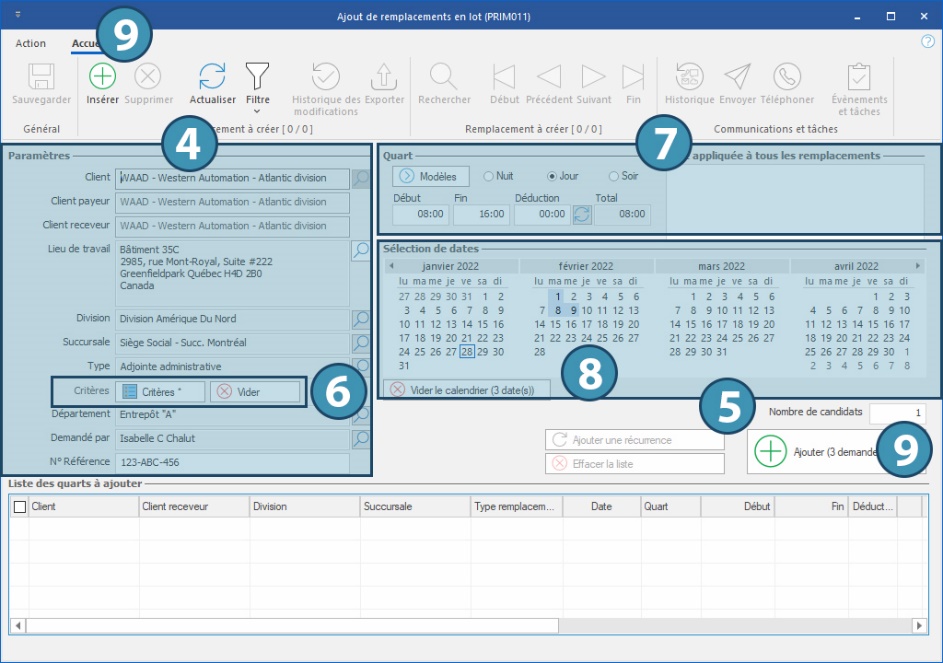 Les quarts sont créés depuis la fenêtre Ajout de quarts en lot (PRIM011).