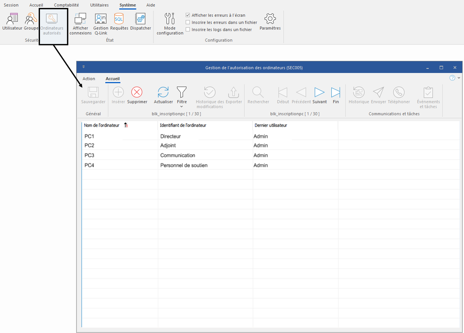 Un utilisateur disposant des droits d'accès suffisants peut consulter et gérer la liste des ordinateurs autorisés à se connecter à PRIM Logix.