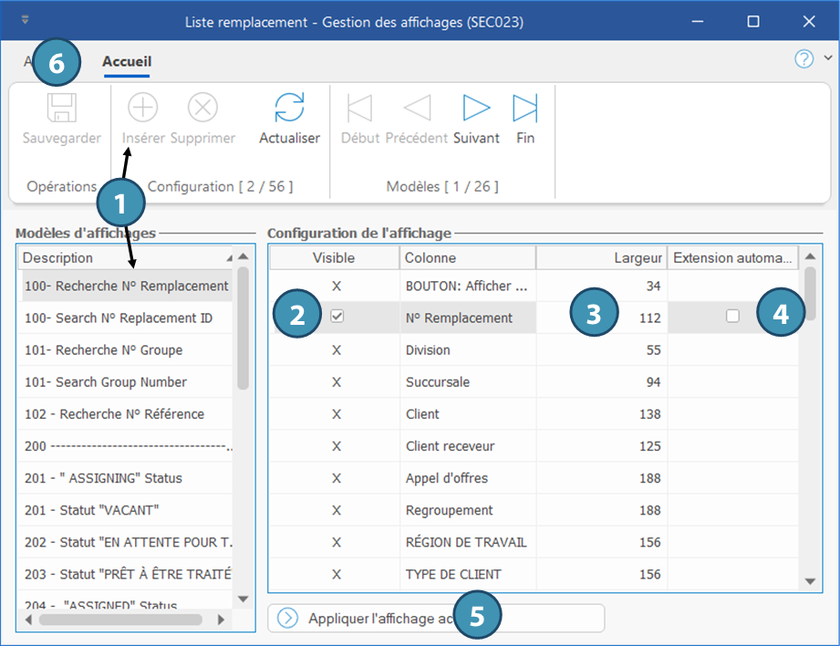5.Si désiré, utilisez le bouton "Appliquer l'affichage actuel" : lors de la création de l’affichage, ce bouton permet de copier la configuration présentement appliquée à la fenêtre. De cette façon, l’utilisateur pourrait ajuster la largeur de chacune des colonnes selon ses préférences, puis ouvrir la fenêtre de création d'un affichage et utiliser le bouton pour enregistrer l’affichage actuel en tant que configuration.