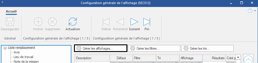Dans une fenêtre dans laquelle il n'est pas possible de configurer un affichage, le bouton sera grisé. Pour accéder aux modèles d'affichage ou créer un affichage, accéder d'abord à la fenêtre « Configuration générale de l'affichage » en cliquant sur l'icône de filtre