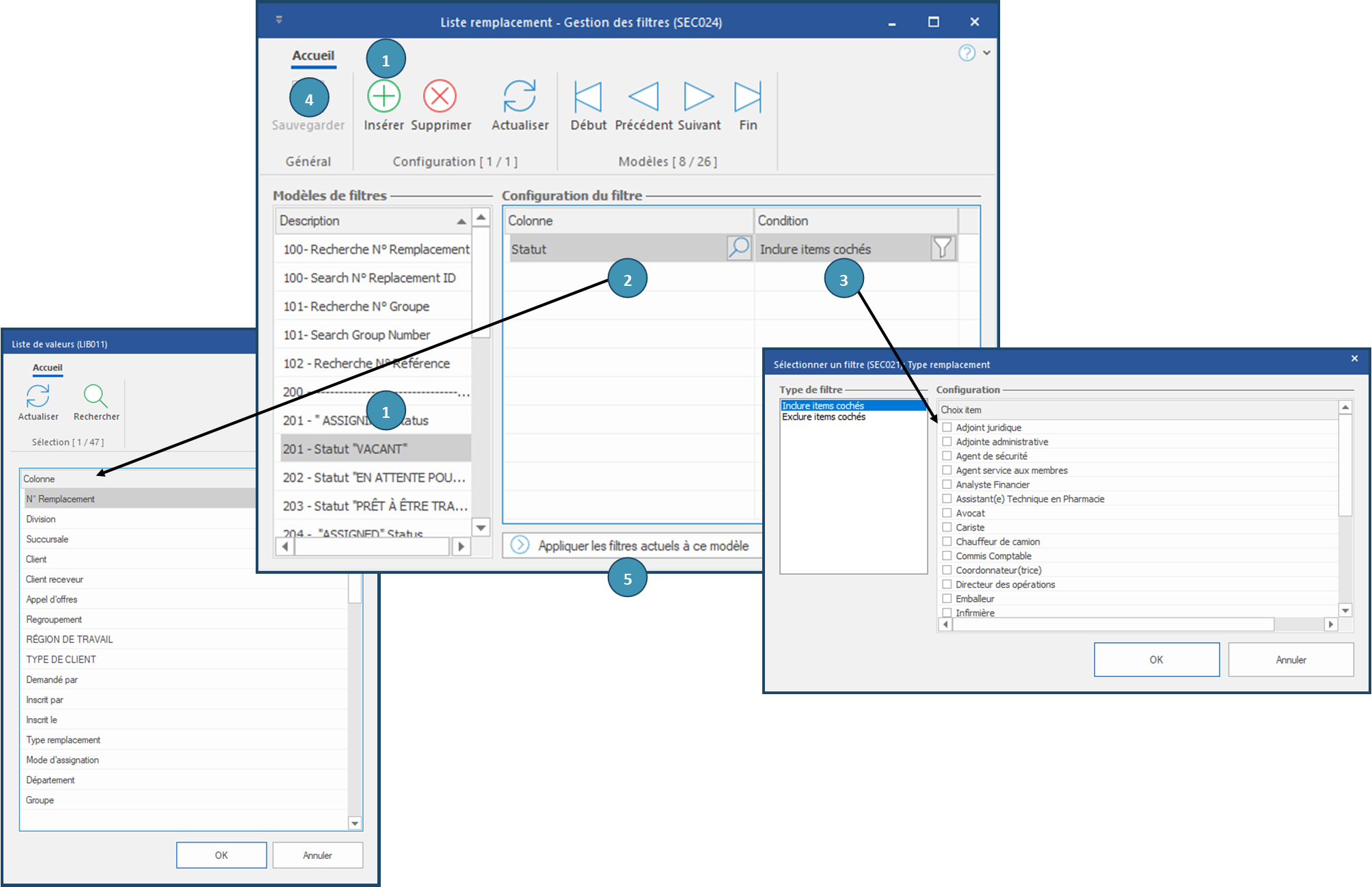 5.Plutôt que les étapes précédentes (2-4) il est également possible de créer les filtres ponctuels sur les colonnes concernées directement dans la fenêtre pour laquelle on souhaite créer une configuration, et d'utiliser ces filtres pour créer le modèle de filtres. Dans la fenêtre de gestion des filtres, après avoir créé, nommé et sauvegardé le modèle de filtres, cliquer sur le bouton « Appliquer les filtres actuels à ce modèle ».