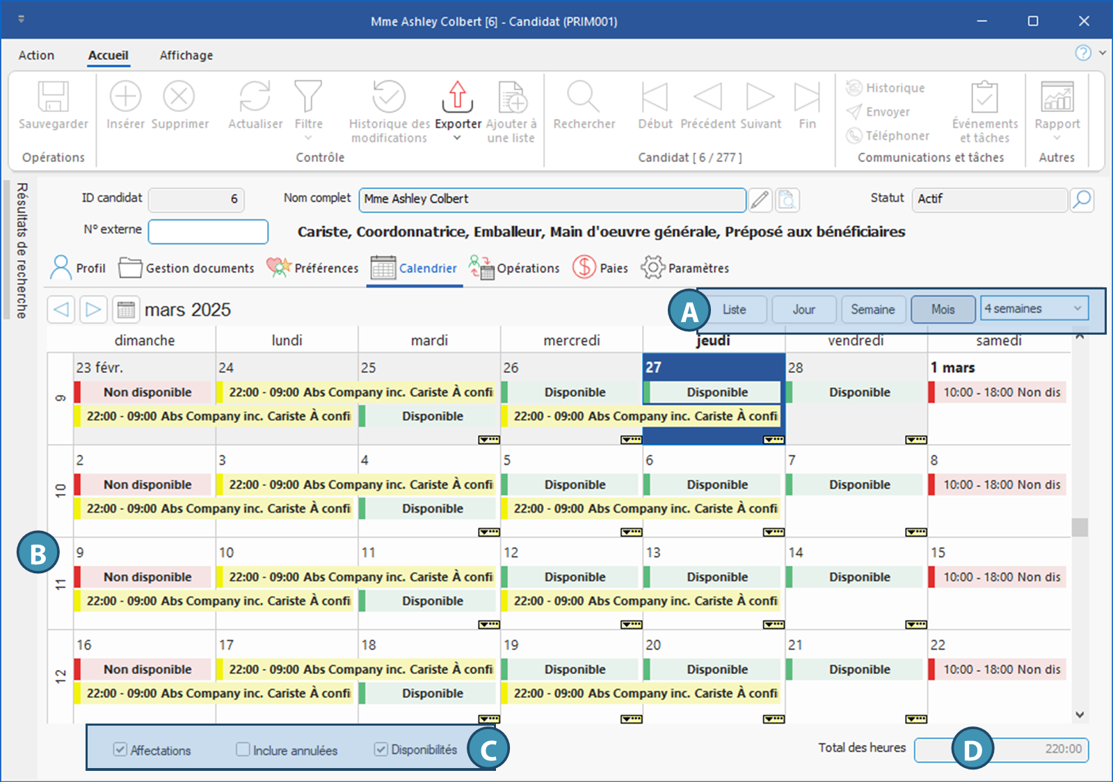 Par ailleurs, les cases à cocher dans le bas du calendrier (C) permettent de déterminer si vous souhaitez afficher les Affectations, les affectations annulées (Inclure annulées) et les Disponibilités.