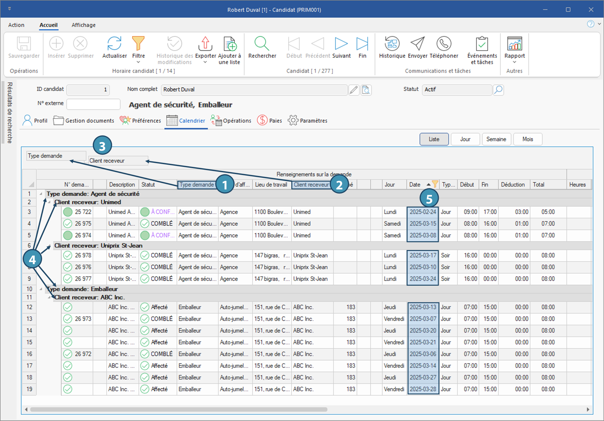 Dans l'exemple ci-dessous, nous avons un candidat qui peut occuper les fonctions Emballeur et Agent de sécurité, et nous avons donc regroupé les affectations en utilisant d'abord le Type de demande, puis le Client receveur.