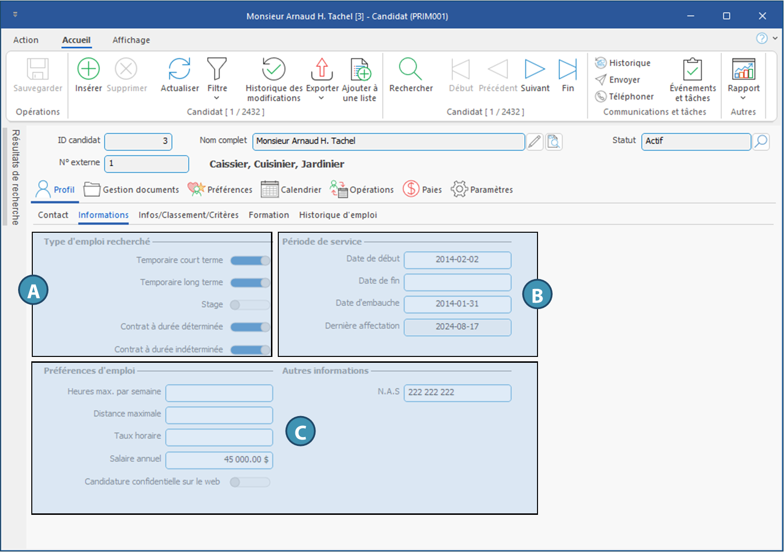 N.A.S. : Numéro d'assurance sociale du candidat. Ce renseignement est essentiel en cas d'intégration avec votre système de paie. L'information peut être masquée au besoin à certains groupes.
