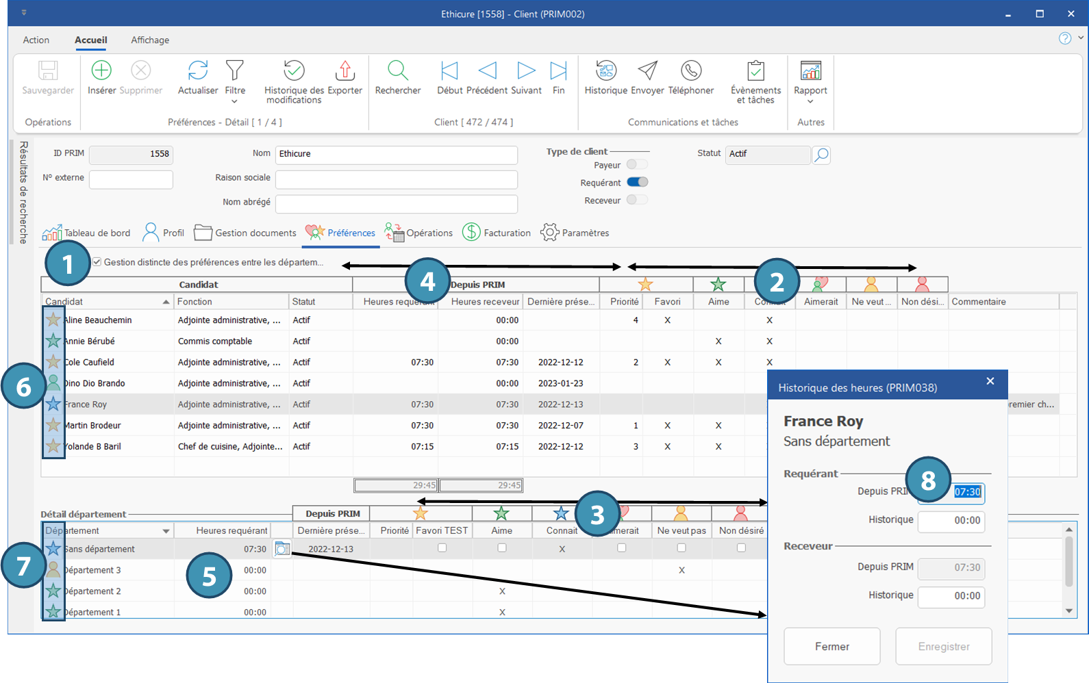 1.Gestion distincte des préférences entre les départements : Si cette case est cochée, les préférences sélectionneées seront gérées selon les départements dans la zone Détail département. Si aucun département n'a été défini pour le client ou pour un quart, le système indiquera Sans département.