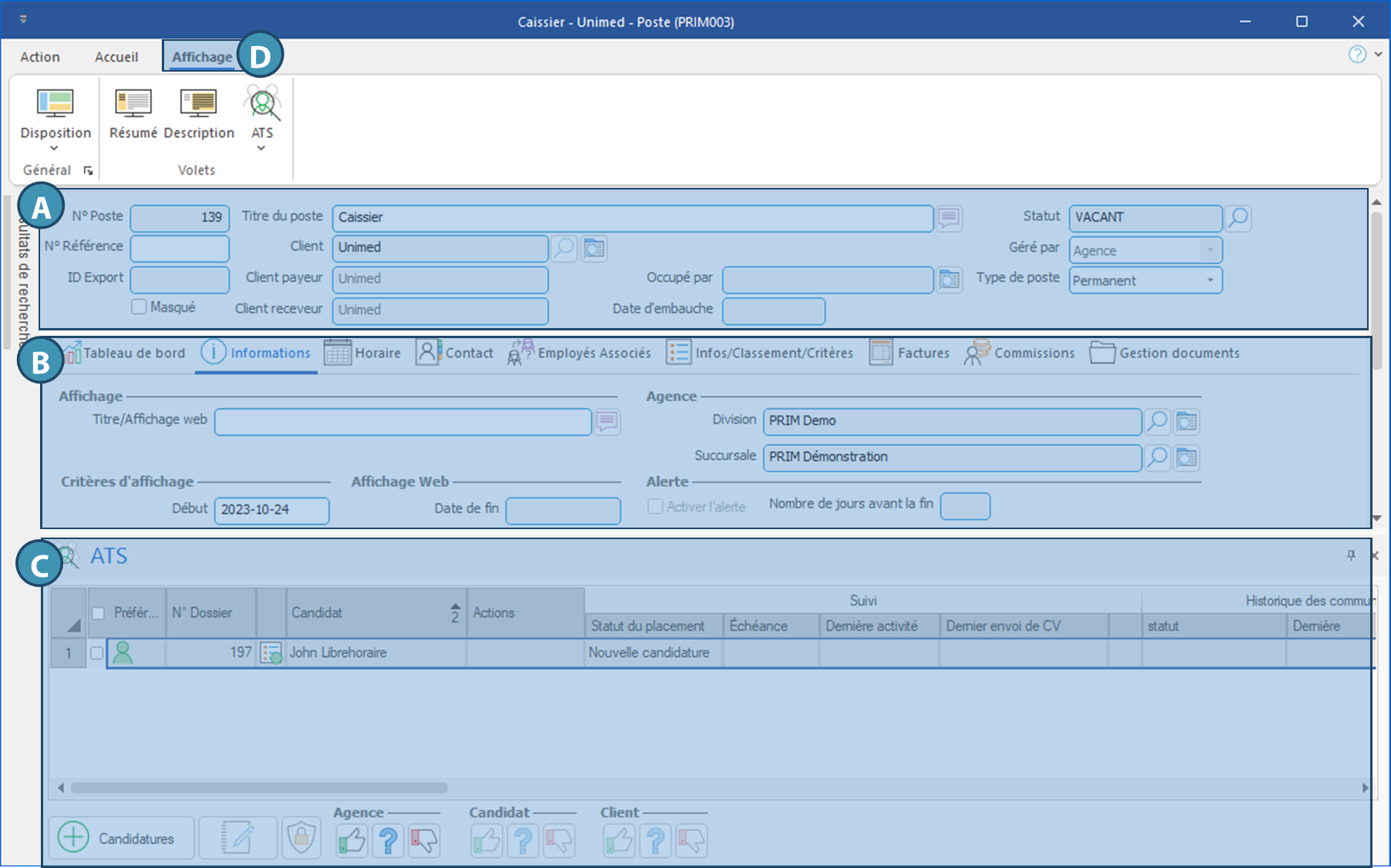 Le volet ATS (C) peut être affiché ou non par défaut dans la fenêtre Poste. Comme il s'agit d'un volet mobile, celui-ci peut s'afficher à différents endroit selon votre disposition, et il est possible de le fermer. Le cas échéant, il sera possible de l'afficher de nouveau à partir du ruban Affichage. Celui-ci permet d'effectuer le suivi des candidatures et d'affecter un candidat.