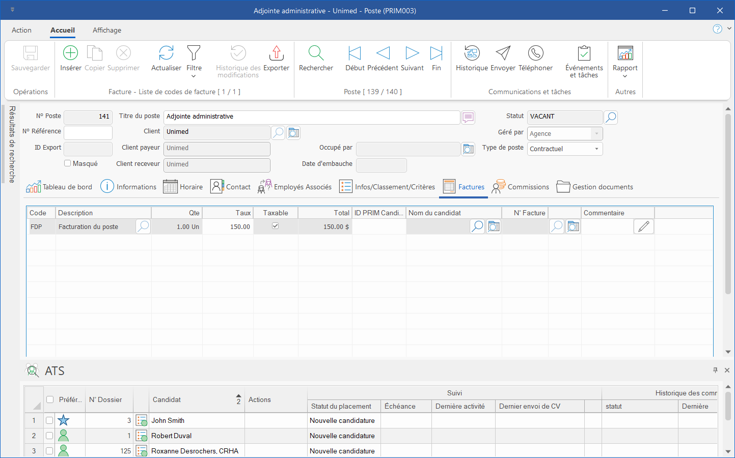 L'onglet « Factures » permet la consultation des éléments à facturer et les éléments facturés en lien avec le poste. Il est possible d'ajouter ou de modifier des éléments. Dans la configuration de base, PRIM insère automatiquement le code de « Facturation du poste » dès qu'un candidat est embauché.