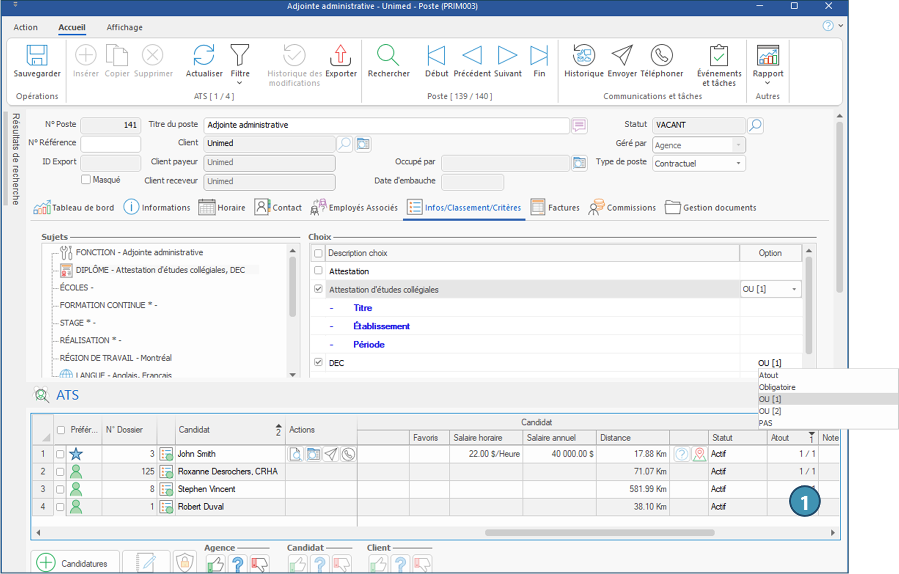 Pour un poste, la correspondance se fait uniquement entre le candidat et le poste. On ne regarde pas les critères du client. Il est donc important de cocher tous les critères que doivent posséder les candidats afin d’avoir la possibilité d’obtenir le poste.