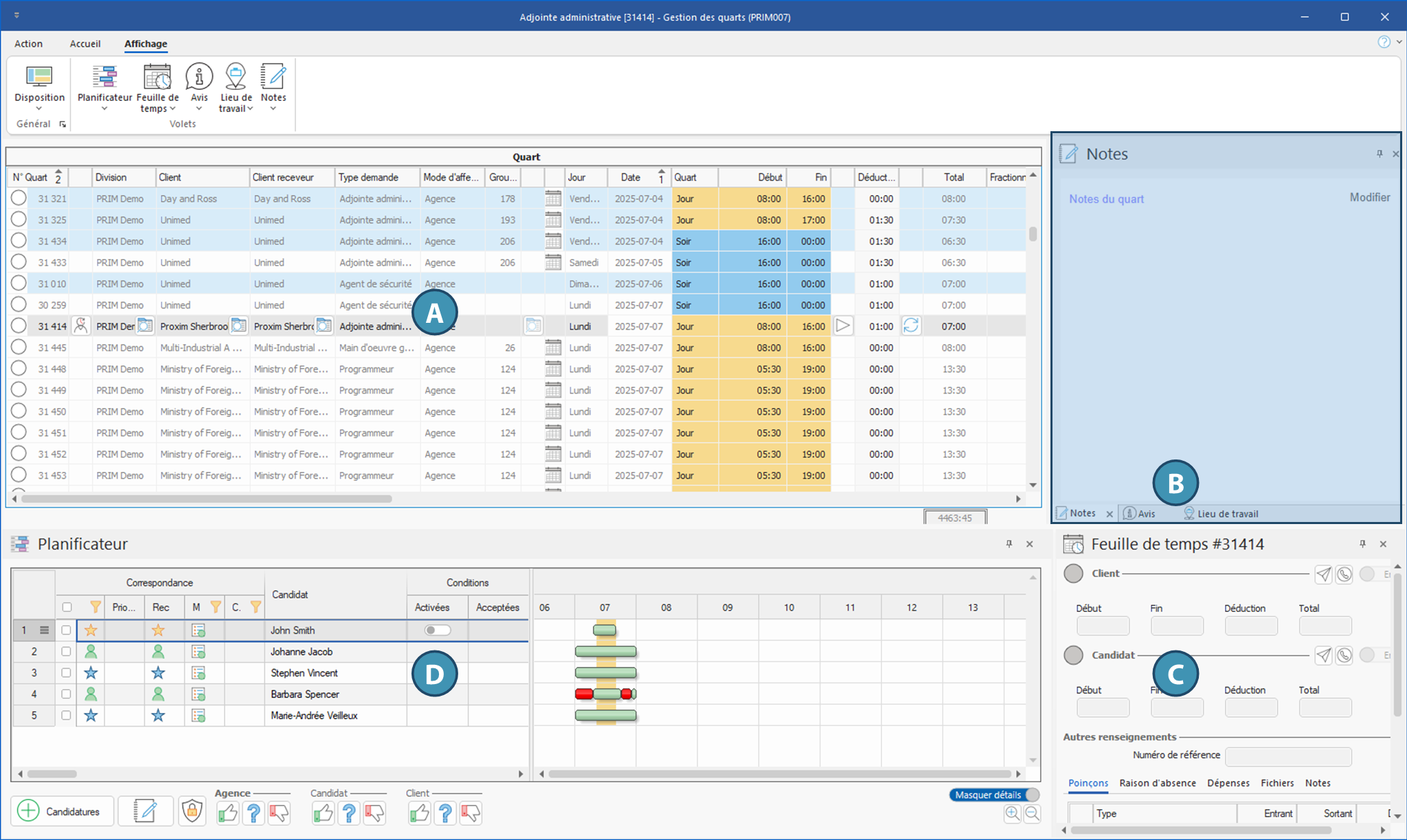 A.La liste des quarts sous forme de tableau : il s'agit de la section principale qui demeure affichée en tout temps.