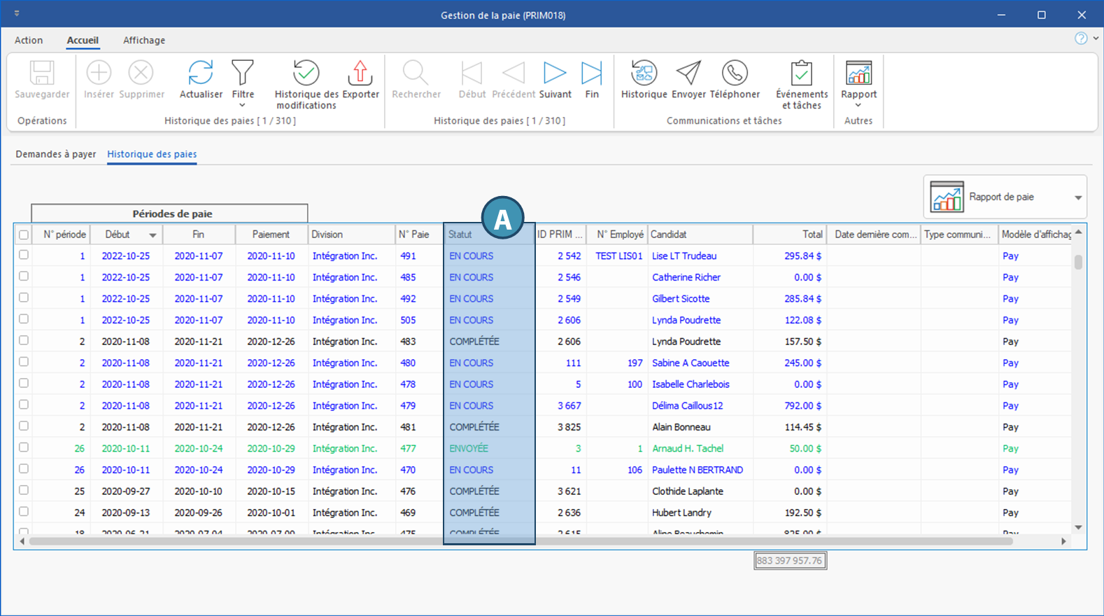 La progression des Statuts de la paie (A) se fait manuellement sous cet onglet.