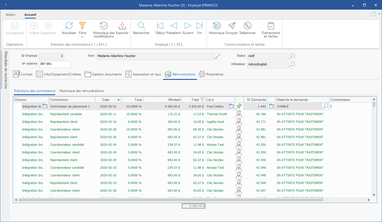 L'onglet « Rémunérations » permet à l'employé de visualiser les informations reliées aux commissions reçues ou à recevoir.