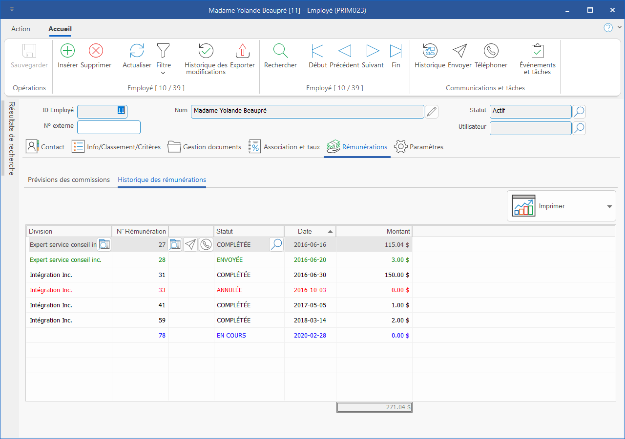 L'onglet « Rémunérations » permet de visualiser les informations reliées aux commissions reçues ou à recevoir par les employés de l'entreprise.